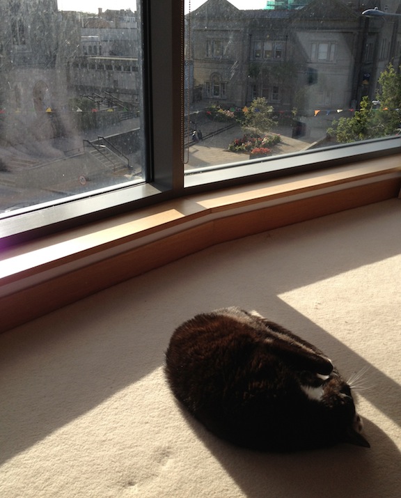 Sept 18 by Melissa | Sep 18, 2012 | Uncategorized Our 19 year old cat in a patch of sunlight. Three minutes later it was lashing rain and the cat was under the bed.